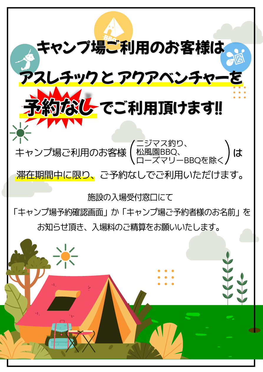 キャンプ場をご宿泊や日帰りでご利用されるお客様は、滞在中(チェックイン前、チェックアウト後も含む)はアスレチック及びアクアベンチャーのご予約は必要ありません。